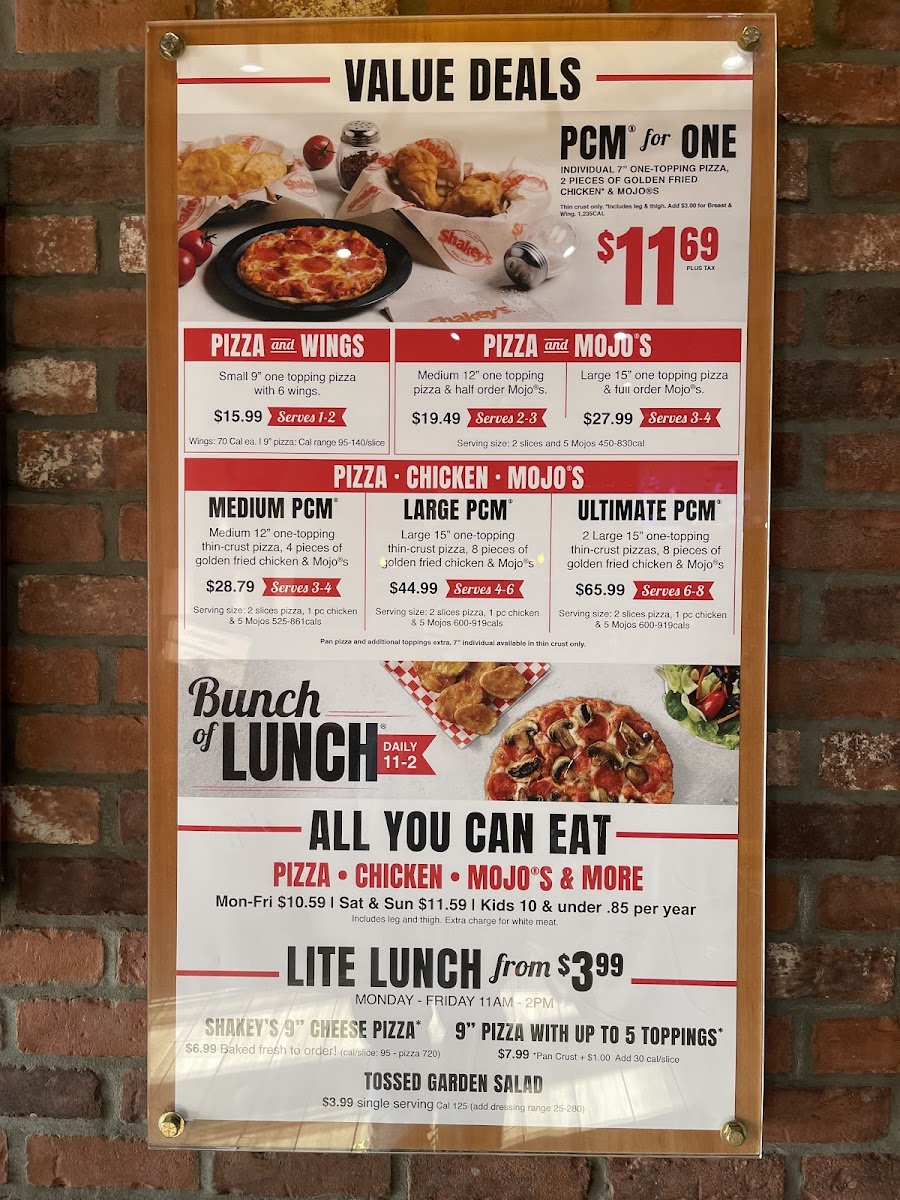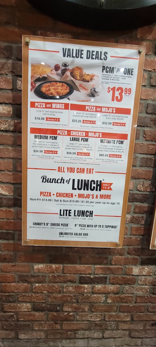 Shakey's Pizza Parlor offers a vibrant menu that caters to families and pizza lovers alike, blending classic favorites with hearty buffet options. Known for its delicious, freshly baked pizzas, the parlor takes pride in crafting pies loaded with quality toppings and perfectly crisp crusts. Alongside pizza, the lunch buffet stands out as a highlight—featuring not only an assortment of pizzas but also a well-stocked salad bar and crispy, flavorful fried chicken. This variety provides guests the freedom to customize their meals or enjoy a full plate of diverse flavors.